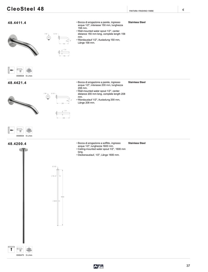 Ceiling-mounted water spout 1/2'', 1600 mm