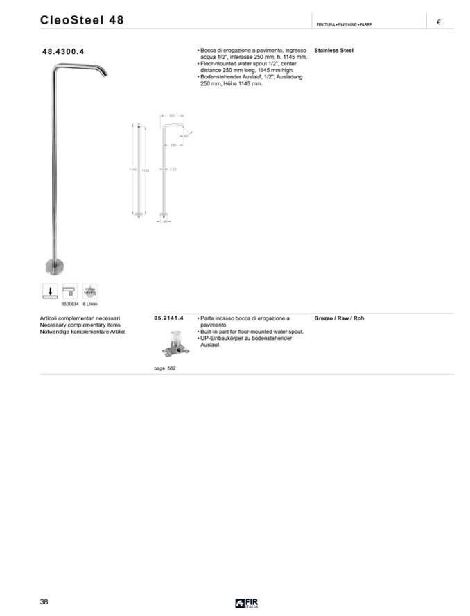 acqua 1/2'', interasse 250 mm, h. 1145 mm.