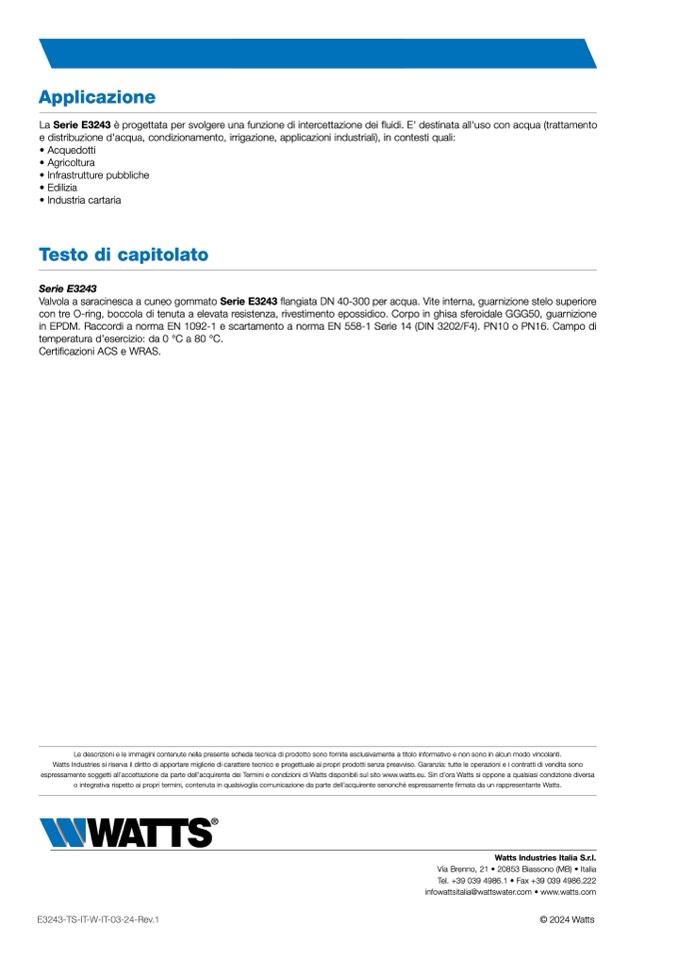 La Serie E3243 è progettata per svolgere una funzione di intercettazione dei fluidi. E' destinata all'uso con acqua (trattamento