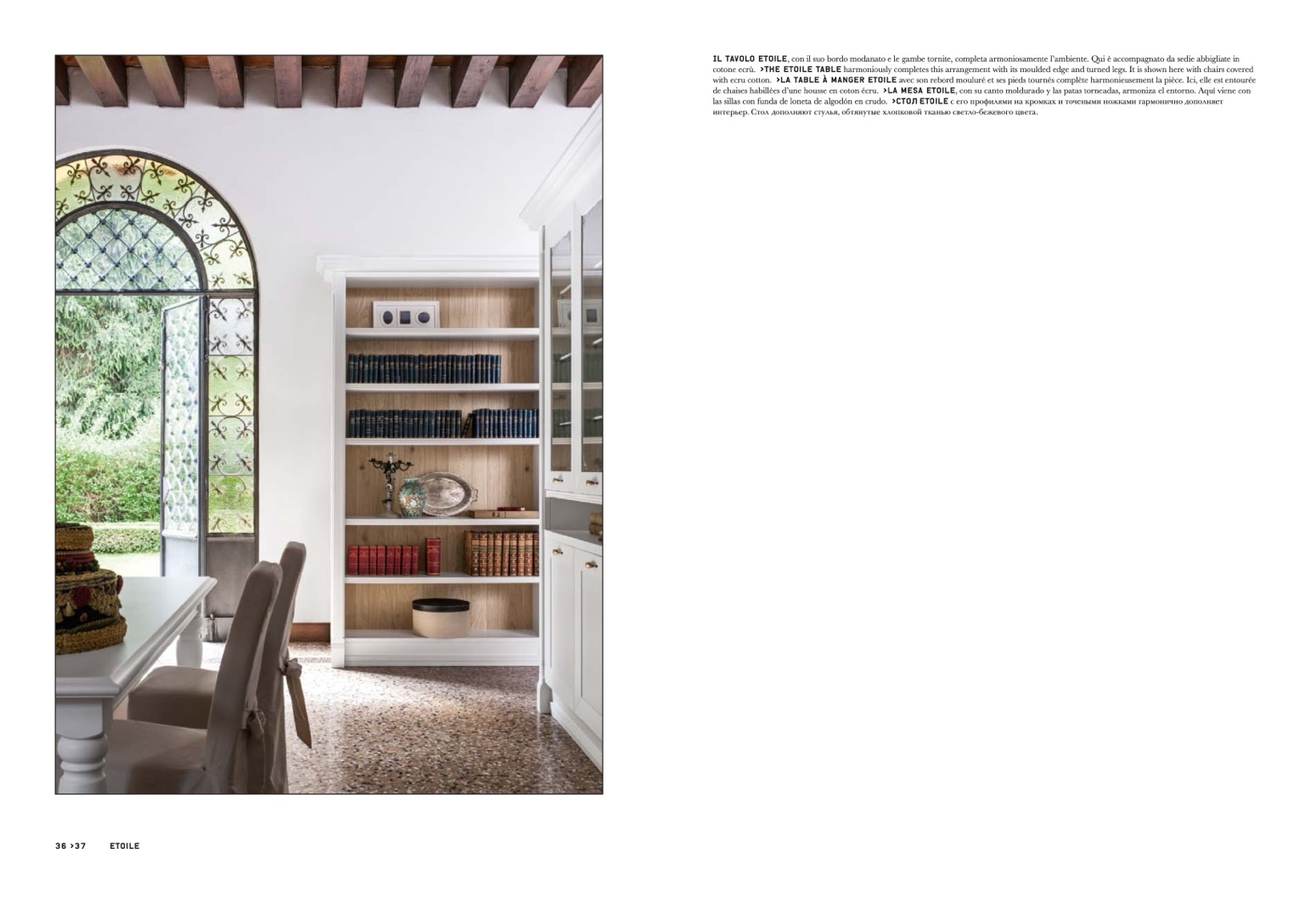 cotone ecrù. >The Etoile table harmoniously completes this arrangement with its moulded edge and turned legs. It is shown here with chairs covered