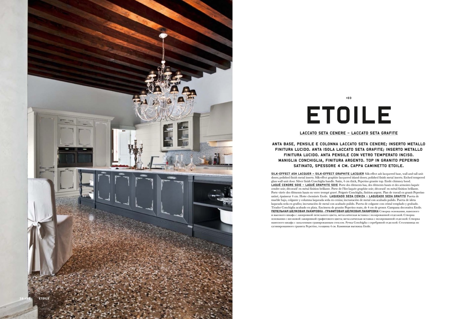 doors; polished finish metal inserts. Silk-effect graphite lacquered island doors; polished finish metal inserts. Etched tempered