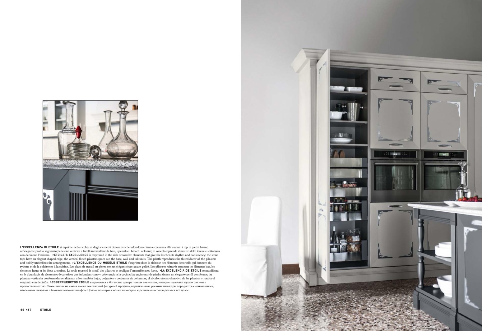 con decisione l’insieme. >Etoile’s excellence is expressed in the rich decorative elements that give the kitchen its rhythm and consistency: the stone