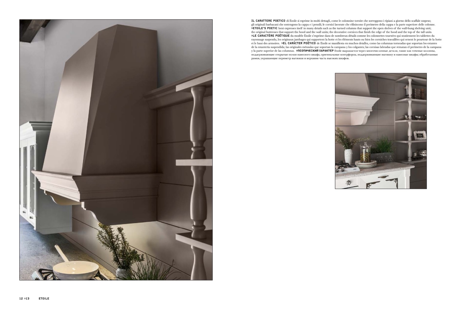 rayonnage suspendu, les originaux jambages qui supportent la hotte et les éléments hauts ou bien les corniches travaillées qui ornent le pourtour de la hotte
