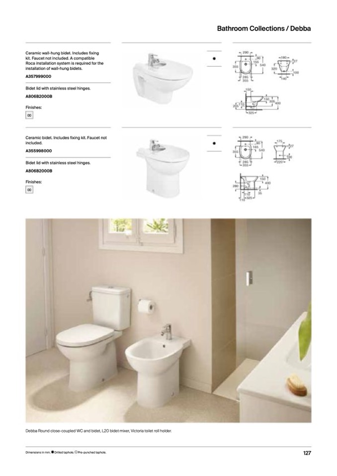 Debba Round close-coupled WC and bidet, L20 bidet mixer, Victoria toilet roll holder.