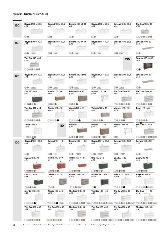 The measures indicated in the technical drawings of the bathroom furniture and mirrors have a tolerance of +2;-1 mm, depending on the model.