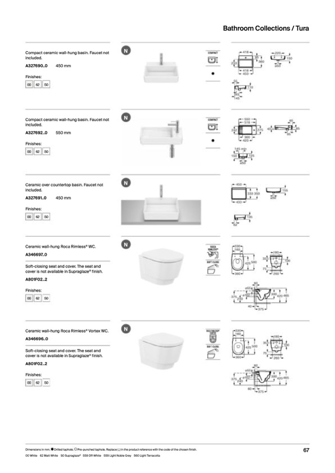Dimensions in mm. Drilled taphole. Pre-punched taphole. Replace (..) in the product reference with the code of the chosen finish.