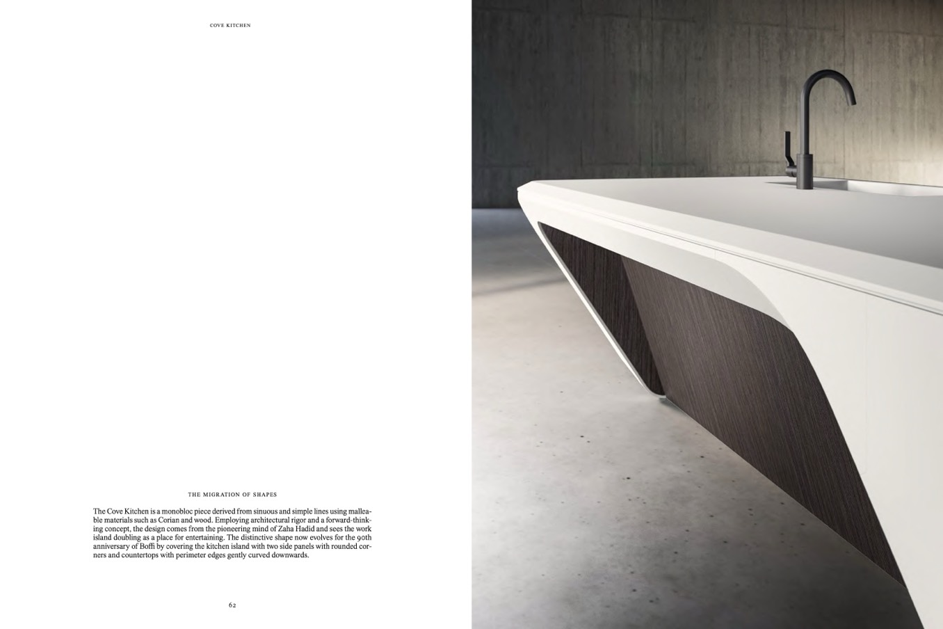 The Cove Kitchen is a monobloc piece derived from sinuous and simple lines using mallea-