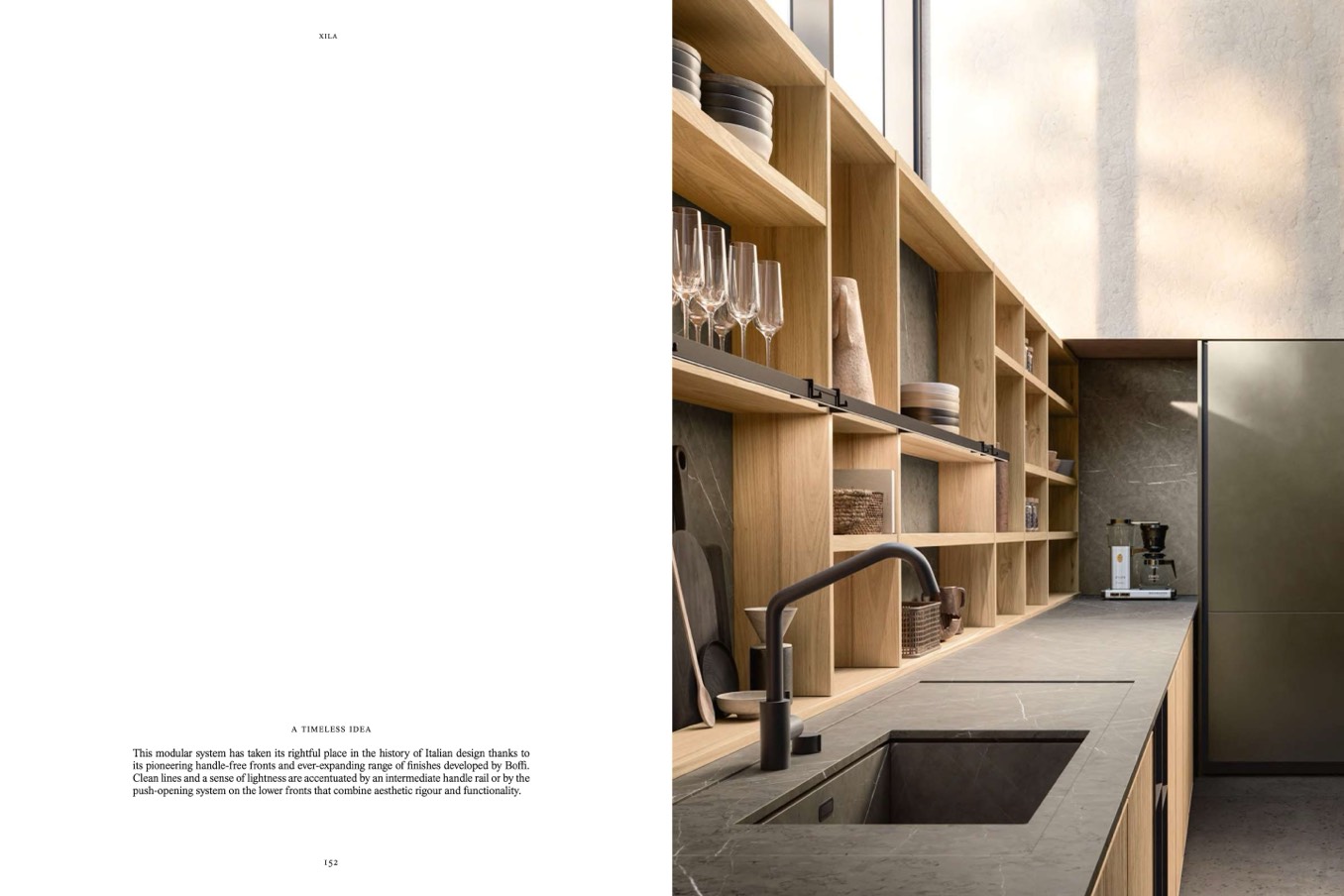 its pioneering handle-free fronts and ever-expanding range of finishes developed by Boffi.