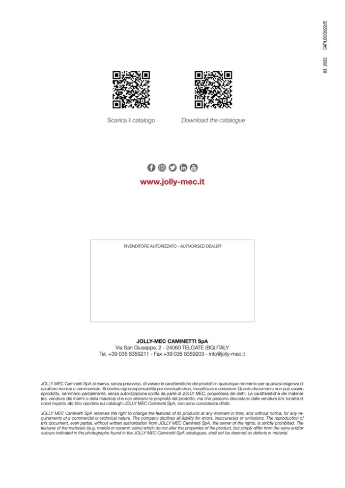 JOLLY MEC Caminetti SpA si riserva, senza preavviso, di variare le caratteristiche dei prodotti in qualunque momento per qualsiasi esigenza di