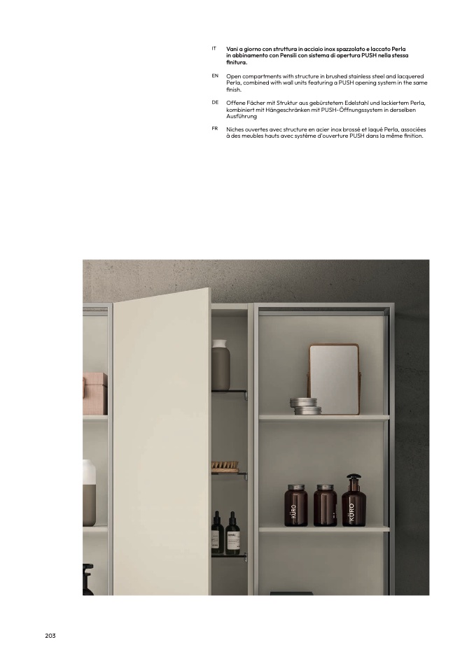 Offene Fächer mit Struktur aus gebürstetem Edelstahl und lackiertem Perla,