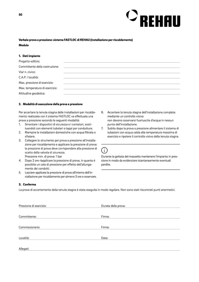Verbale prova a pressione: sistema FASTLOC di REHAU (installazione per riscaldamento)