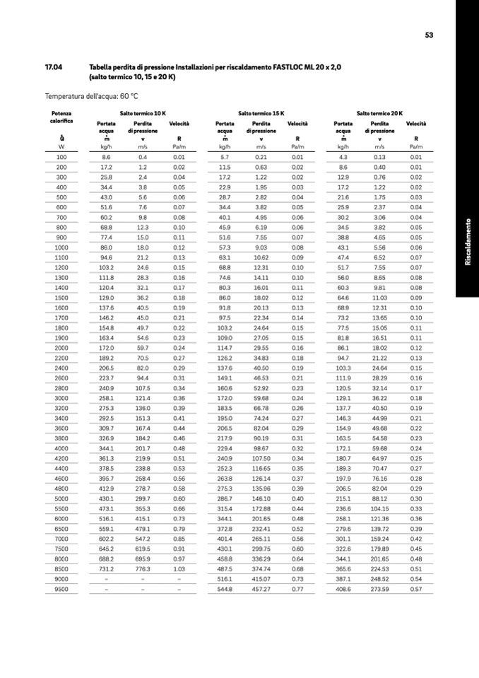 Tabella perdita di pressione Installazioni per riscaldamento FASTLOC ML 20 x 2,0