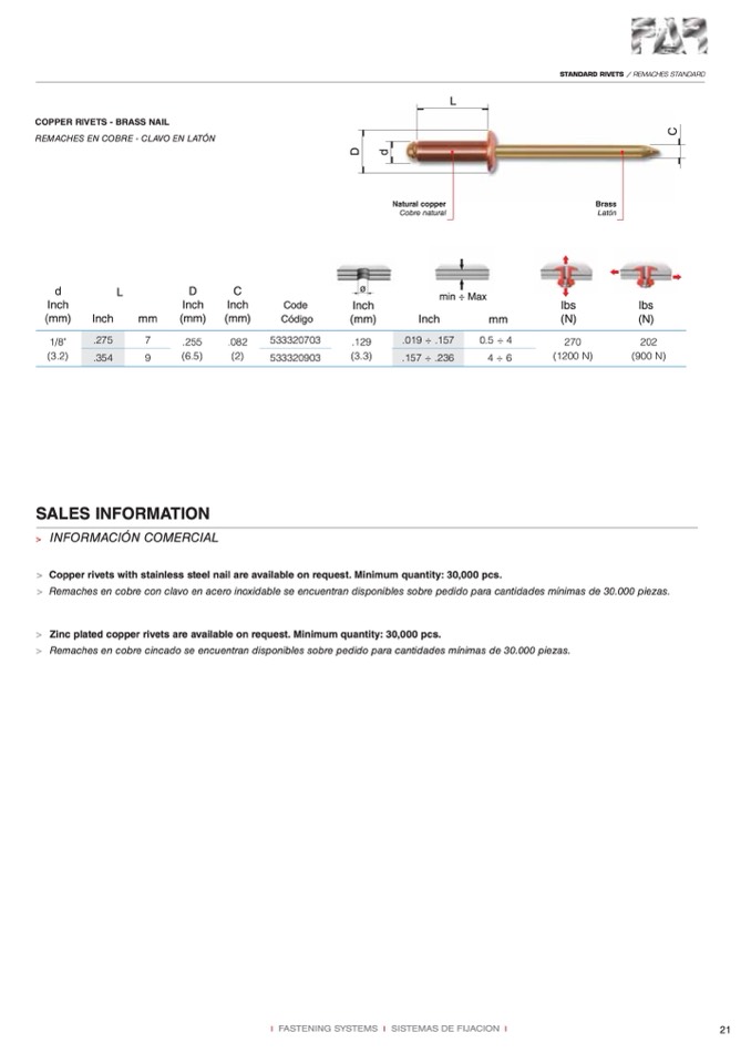 > Remaches en cobre cincado se encuentran disponibles sobre pedido para cantidades mínimas de 30.000 piezas.