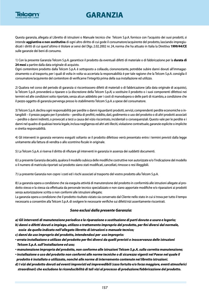 Questa garanzia, allegata al Libretto di istruzioni o Manuale tecnico che Telcom S.p.A. fornisce con l’acquisto dei suoi prodotti, si