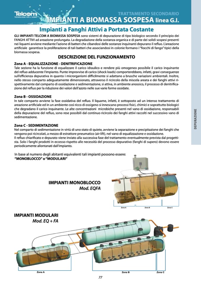 GLI IMPIANTI TELCOM A BIOMASSA SOSPESA sono sistemi di depurazione di tipo biologico secondo il principio dei