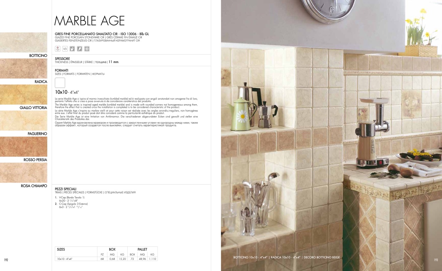La serie Marble Age si ispira al marmo invecchiato (tumbled marble) ed è realizzata con angoli arrotondati non omogenei fra di loro,
