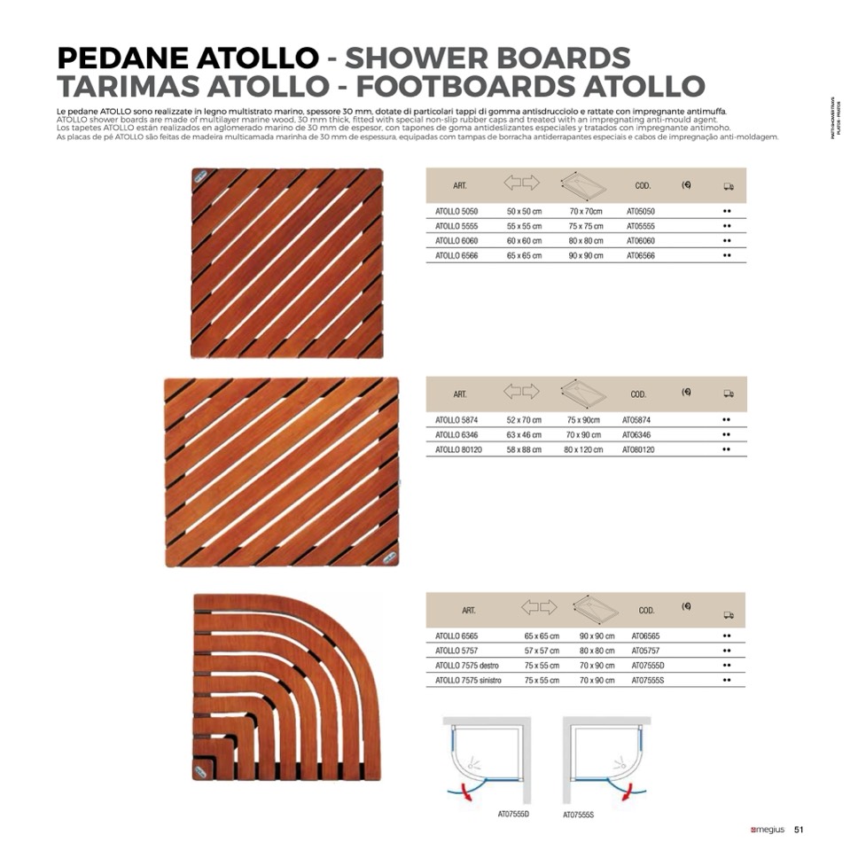 ATOLLO shower boards are made of multilayer marine wood, 30 mm thick, fitted with special non-slip rubber caps and treated with an impregnating anti-mould agent.