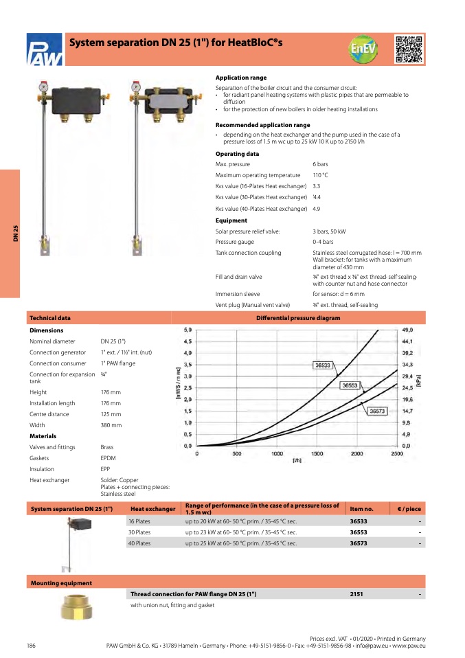pressure loss of 1.5 m wc up to 25 kW 10 K up to 2150 l/h
