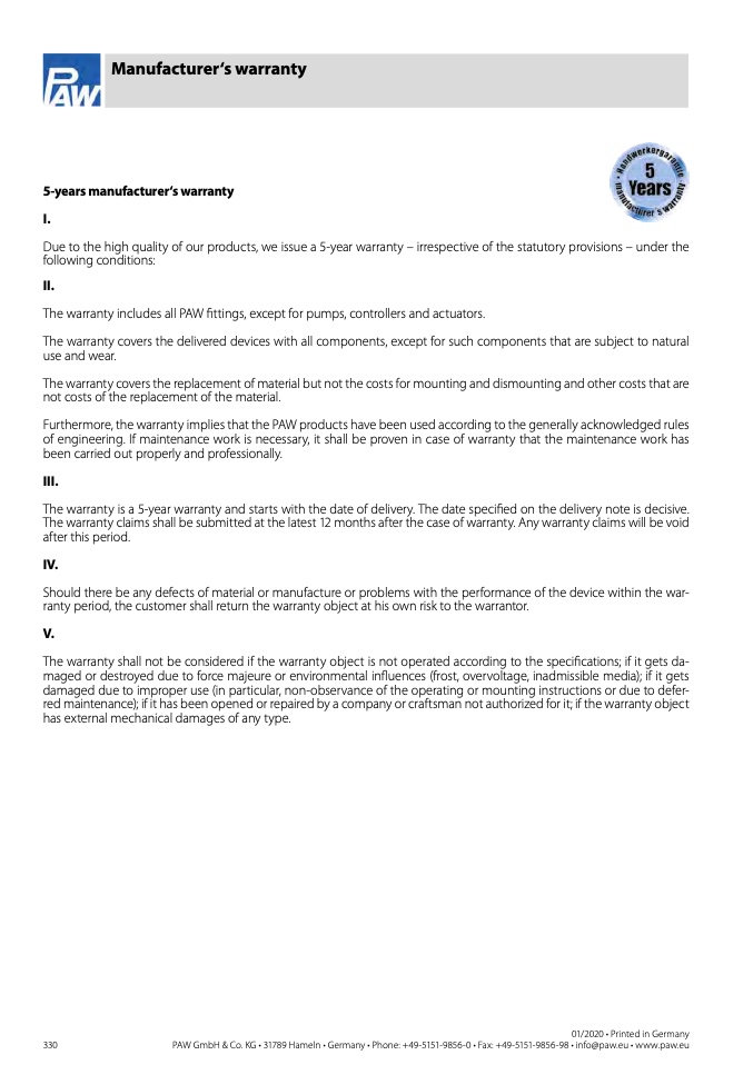 The warranty includes all PAW fittings, except for pumps, controllers and actuators.