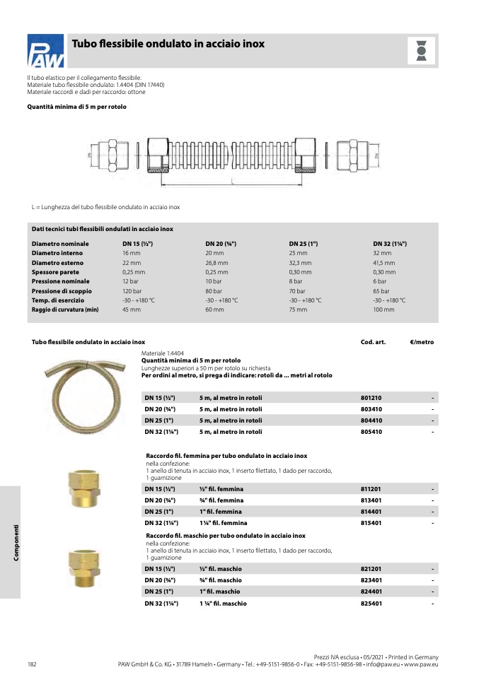 Dati tecnici tubi flessibili ondulati in acciaio inox