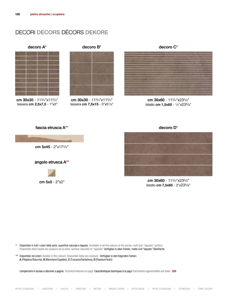 Disponible dans toutes les couleurs de la série, surface naturelle et “lappata” Verfügbar in allen Farben, matte und “lappata” Oberflache