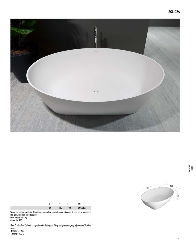 Vasca da bagno ovale in Cristalplant, completa di piletta con sistema di scarico a pressione