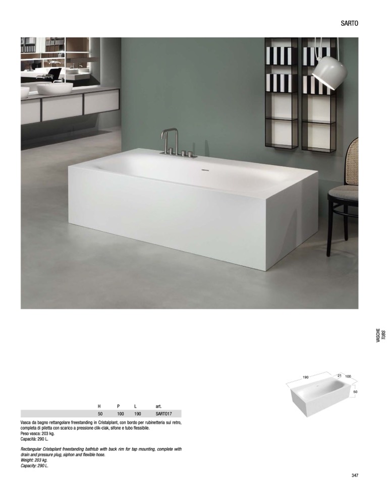 Rectangular Cristaplant freestanding bathtub with back rim for tap mounting, complete with