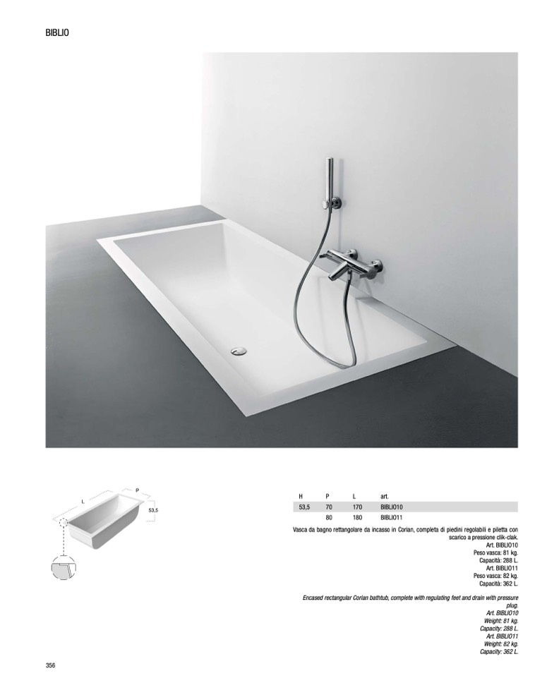Vasca da bagno rettangolare da incasso in Corian, completa di piedini regolabili e piletta con