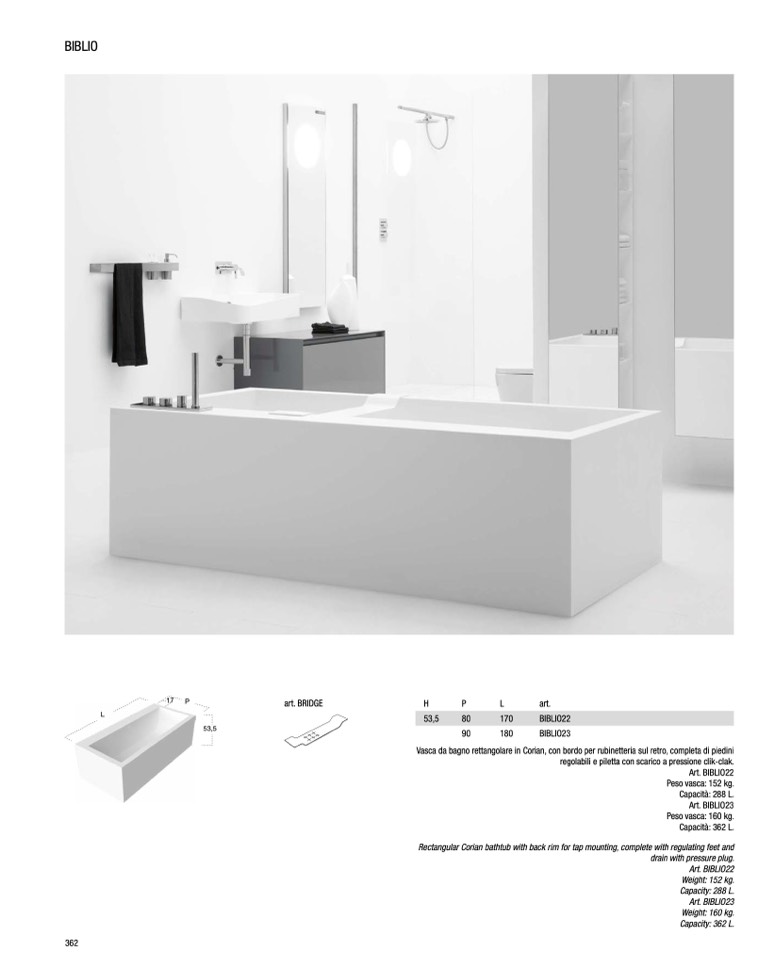 Vasca da bagno rettangolare in Corian, con bordo per rubinetteria sul retro, completa di piedini