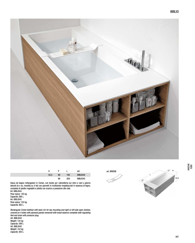 Vasca da bagno rettangolare in Corian, con bordo per rubinetteria sul retro e vani a giorno