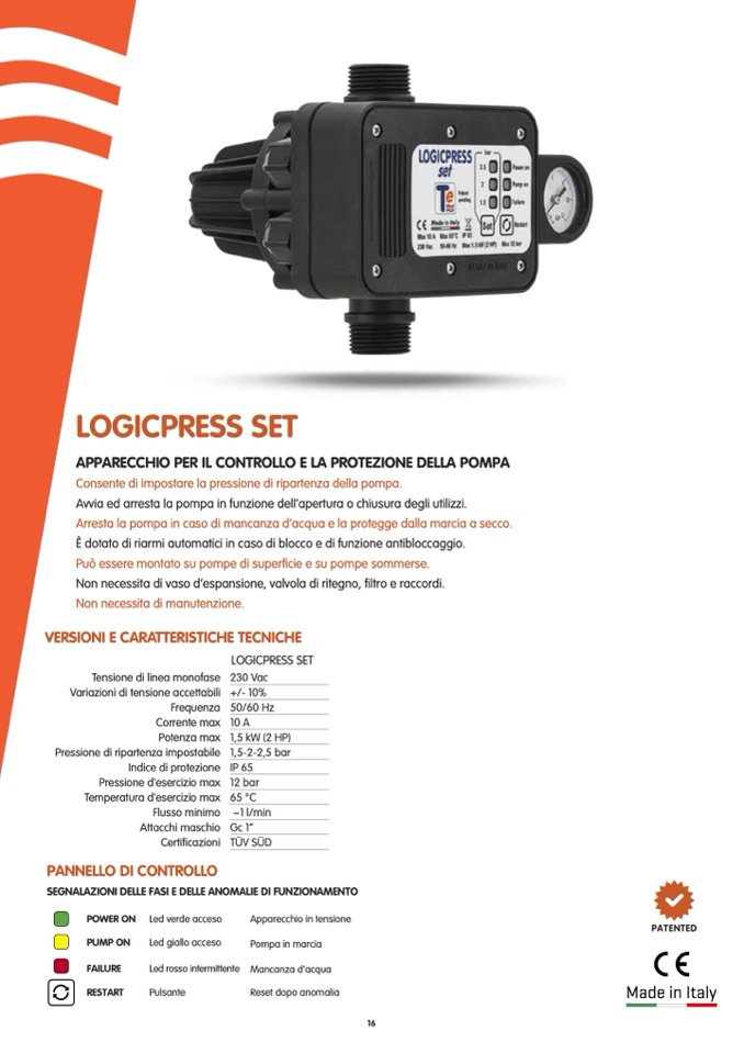 Arresta la pompa in caso di mancanza d’acqua e la protegge dalla marcia a secco.