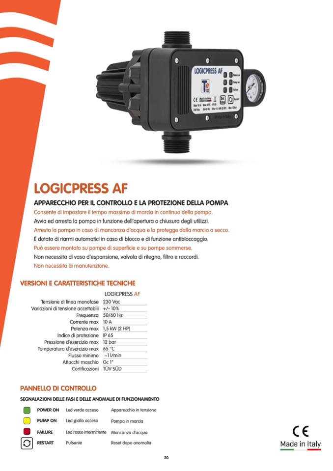 Arresta la pompa in caso di mancanza d’acqua e la protegge dalla marcia a secco.