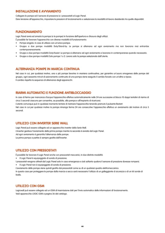 Logic Panel avvia ed arresta la pompa (o le pompe) in funzione dell’apertura e chiusura degli utilizzi.