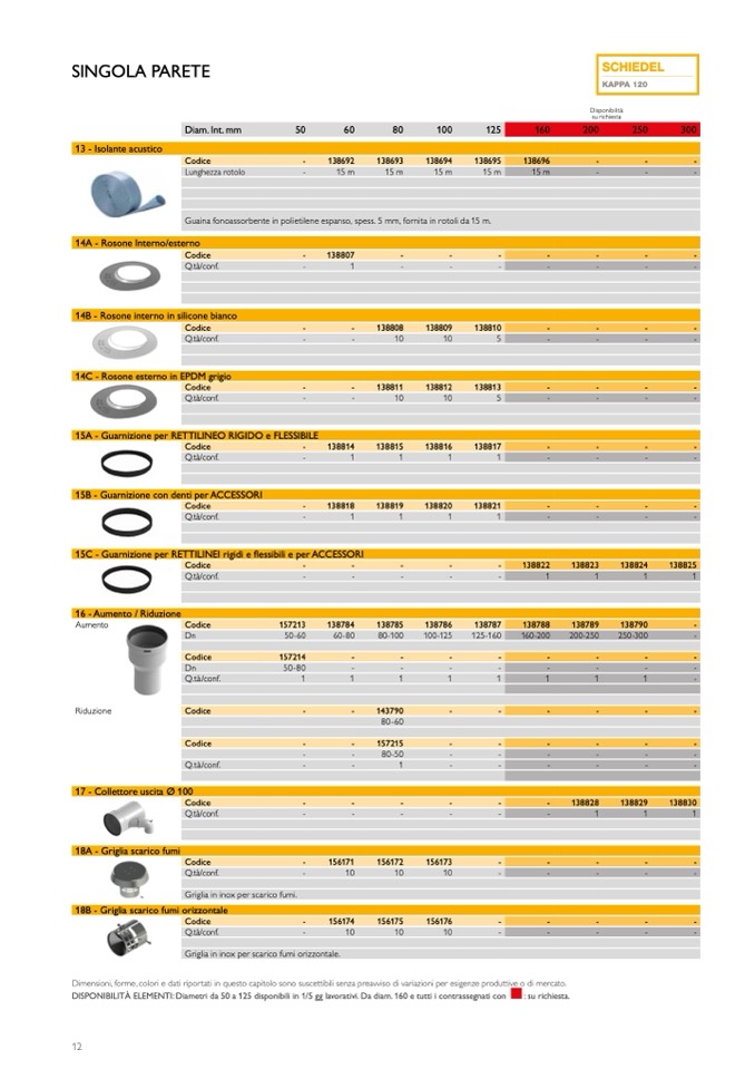 DISPONIBILITÀ ELEMENTI: Diametri da 50 a 125 disponibili in 1/5 gg lavorativi. Da diam. 160 e tutti i contrassegnati con