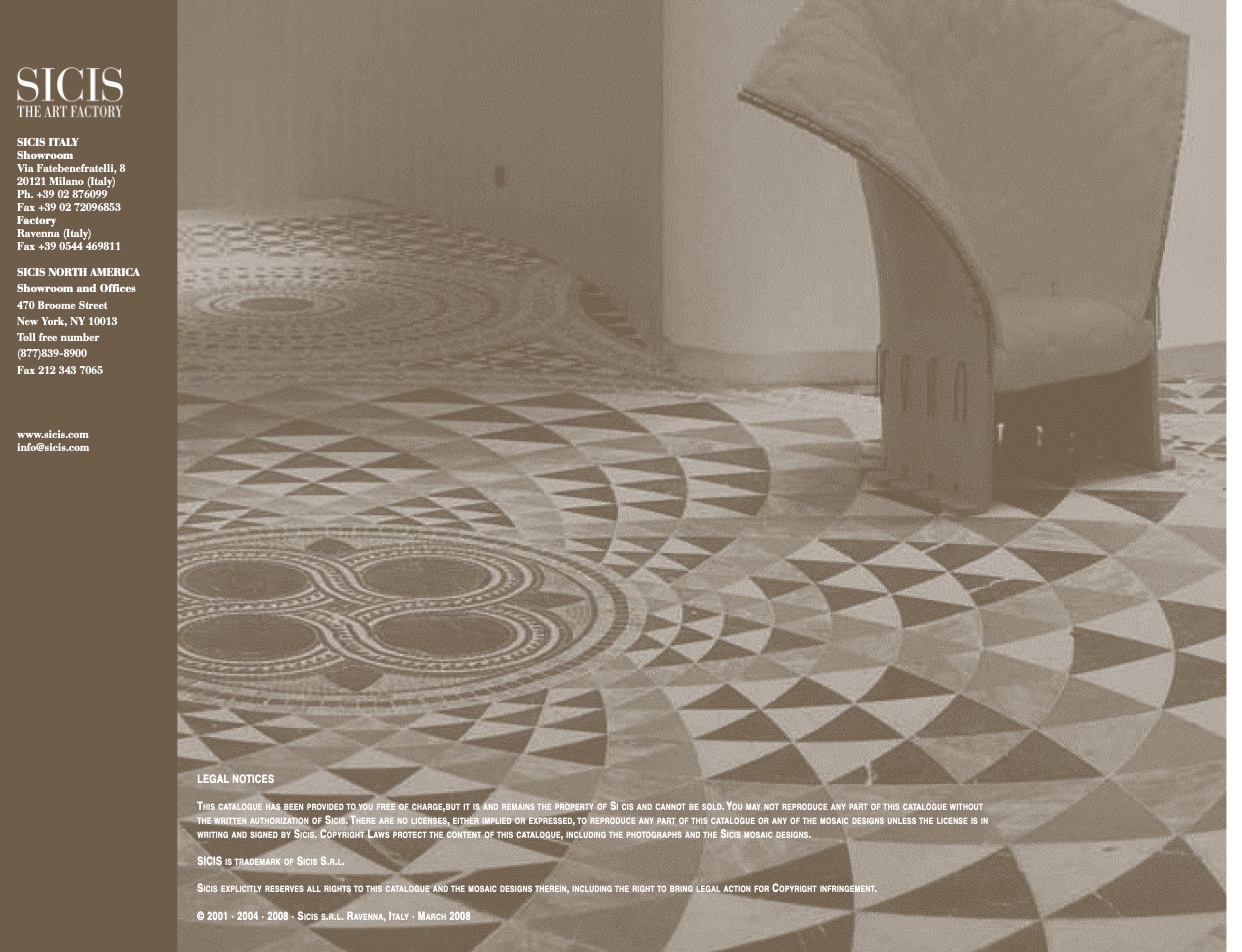 SICIS EXPLICITLY RESERVES ALL RIGHTS TO THIS CATALOGUE AND THE MOSAIC DESIGNS THEREIN, INCLUDING THE RIGHT TO BRING LEGAL ACTION FOR COPYRIGHT INFRINGEMENT.