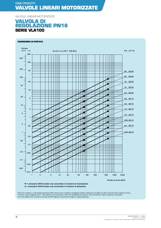 Fattori da considerare: in sede di dimensionamento della valvola occorre considerare che l’aggiunta di glicole nell’acqua ha un effetto sia sulla viscosità che sulla conduzione termica.