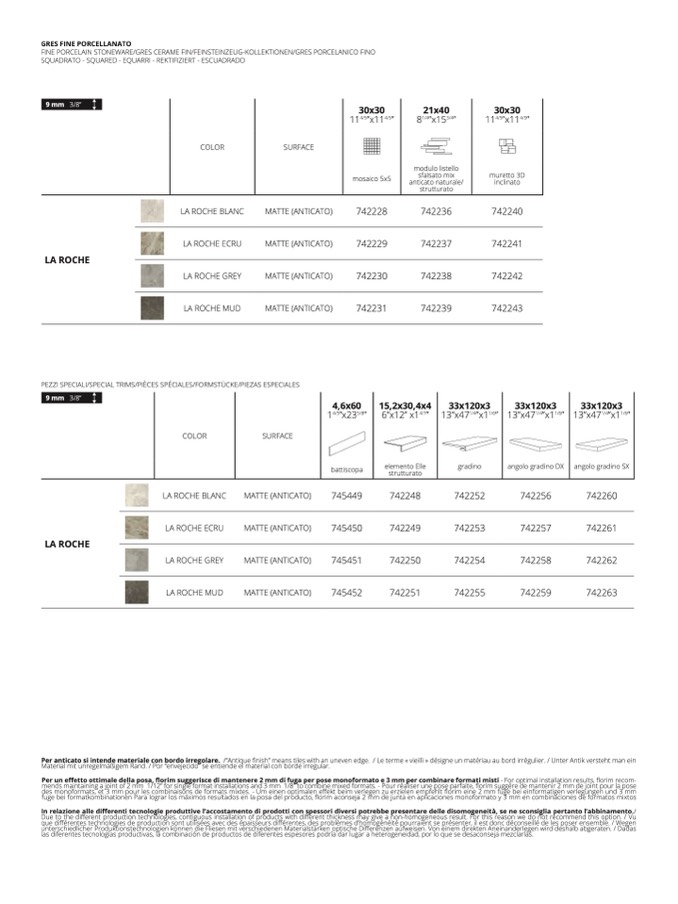 noformats, et 3 mm pour les combinaisons de formats mixtes. - Um einen optimalen effekt beim verlegen zu erzielen empfehlt florim eine 2 mm fuge bei einformatigen verlegungen und 3 m