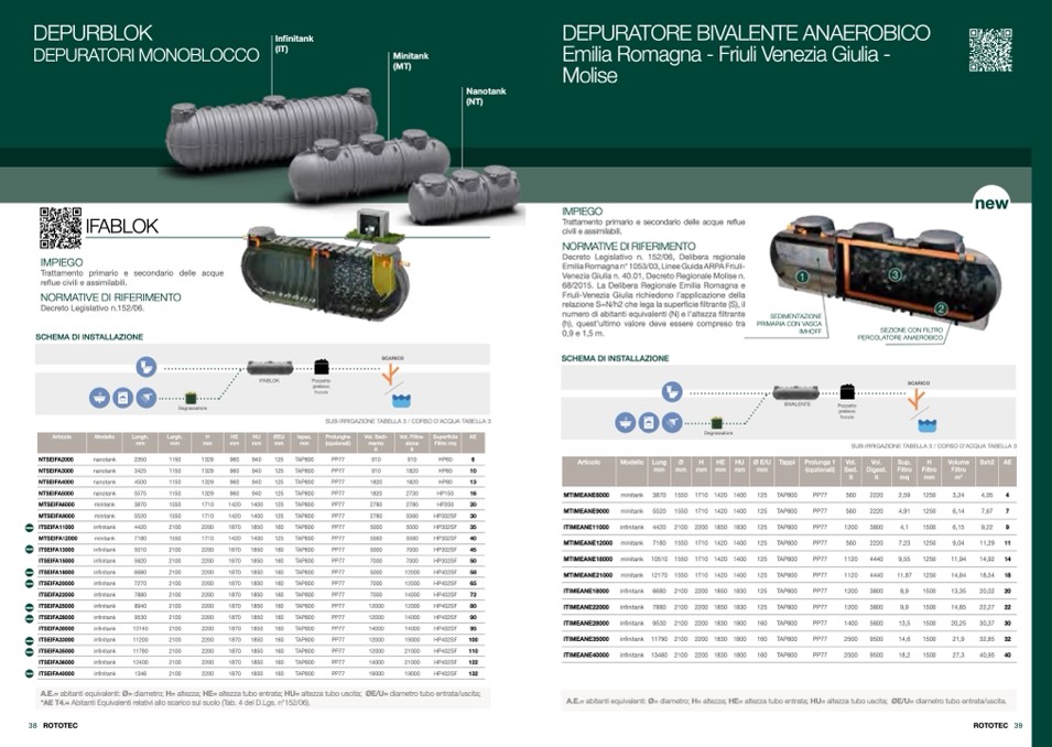 A.E.= abitanti equivalenti: Ø= diametro; H= altezza; HE= altezza tubo entrata; HU= altezza tubo uscita; ØE/U= diametro tubo entrata/uscita.