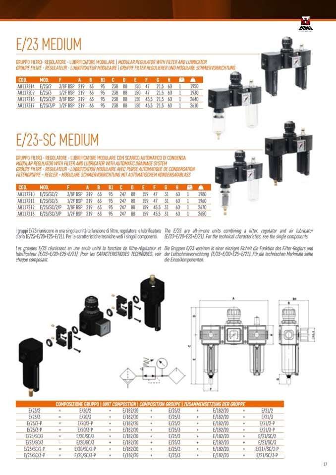 The E/23 are all-in-one units combining a filter, regulator and air lubricator
