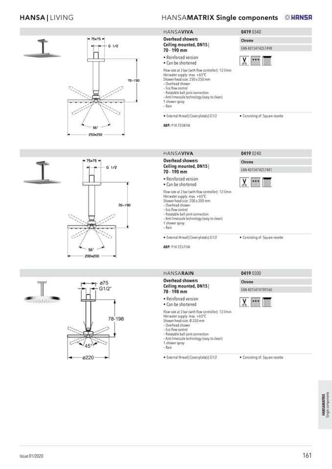 Shower head size: 250 x 250 mm