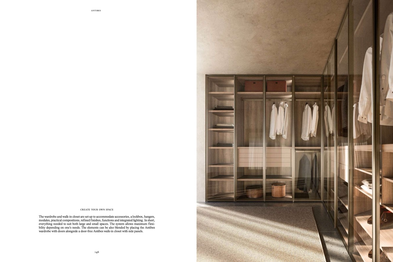 wardrobe with doors alongside a door-free Antibes walk-in closet with side panels.