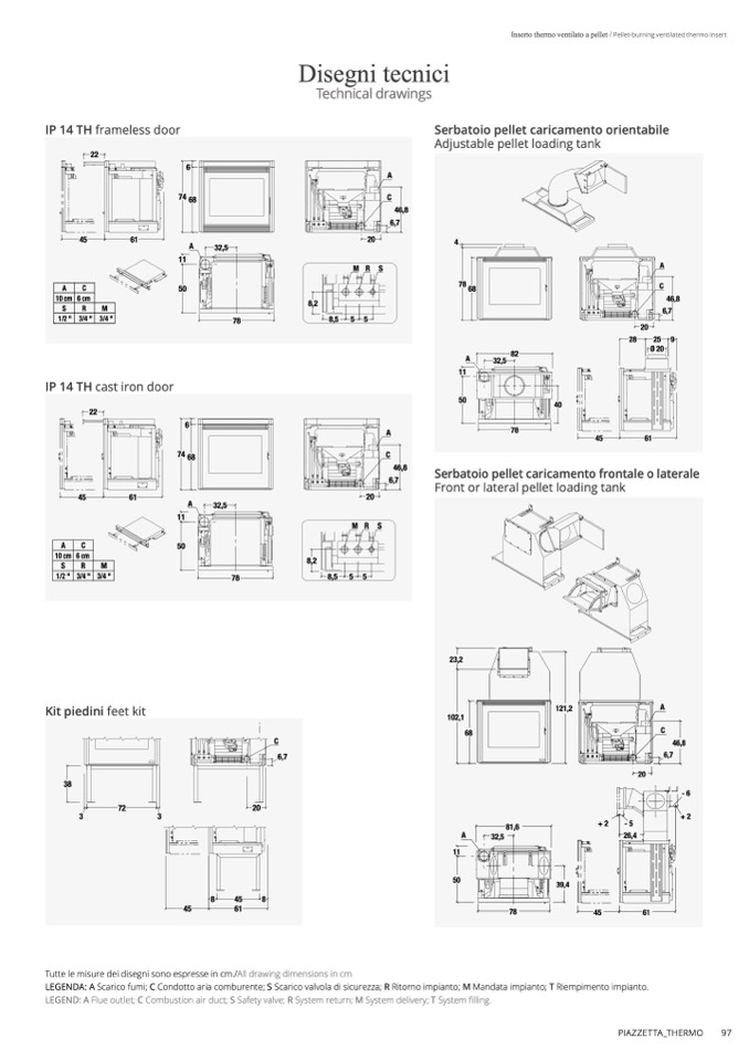 LEGENDA: A Scarico fumi; C Condotto aria comburente; S Scarico valvola di sicurezza; R Ritorno impianto; M Mandata impianto; T Riempimento impianto.
