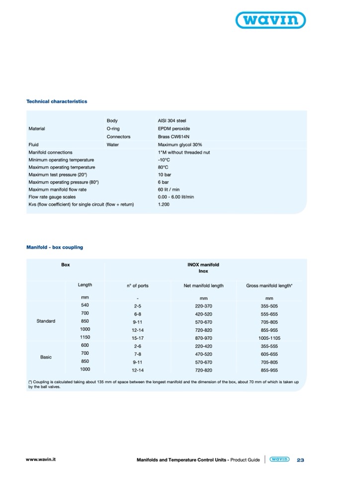 (*) Coupling is calculated taking about 135 mm of space between the longest manifold and the dimension of the box, about 70 mm of which is taken up