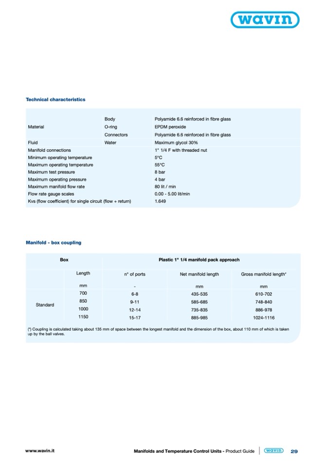 (*) Coupling is calculated taking about 135 mm of space between the longest manifold and the dimension of the box, about 110 mm of which is taken