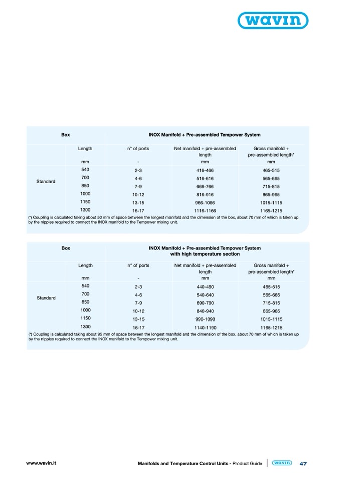 (*) Coupling is calculated taking about 50 mm of space between the longest manifold and the dimension of the box, about 70 mm of which is taken up