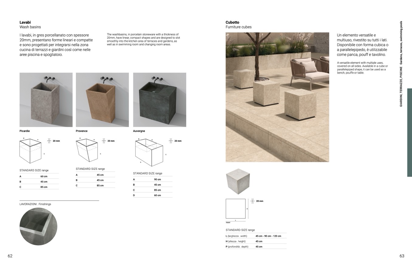 The washbasins, in porcelain stoneware with a thickness of