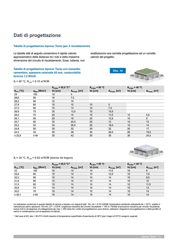 Le indicazioni contenute in queste tabelle di calcolo si basano sui seguenti dati: Rλ, ins = 0,75 m2K/W, temperatura ambiente sottostante θu = 20°C, soletta in