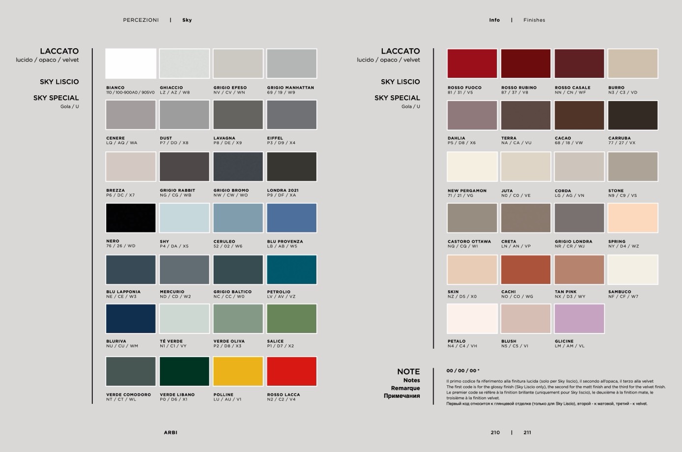 The first code is for the glossy finish (Sky Liscio only), the second for the matt finish and the third for the velvet finish.