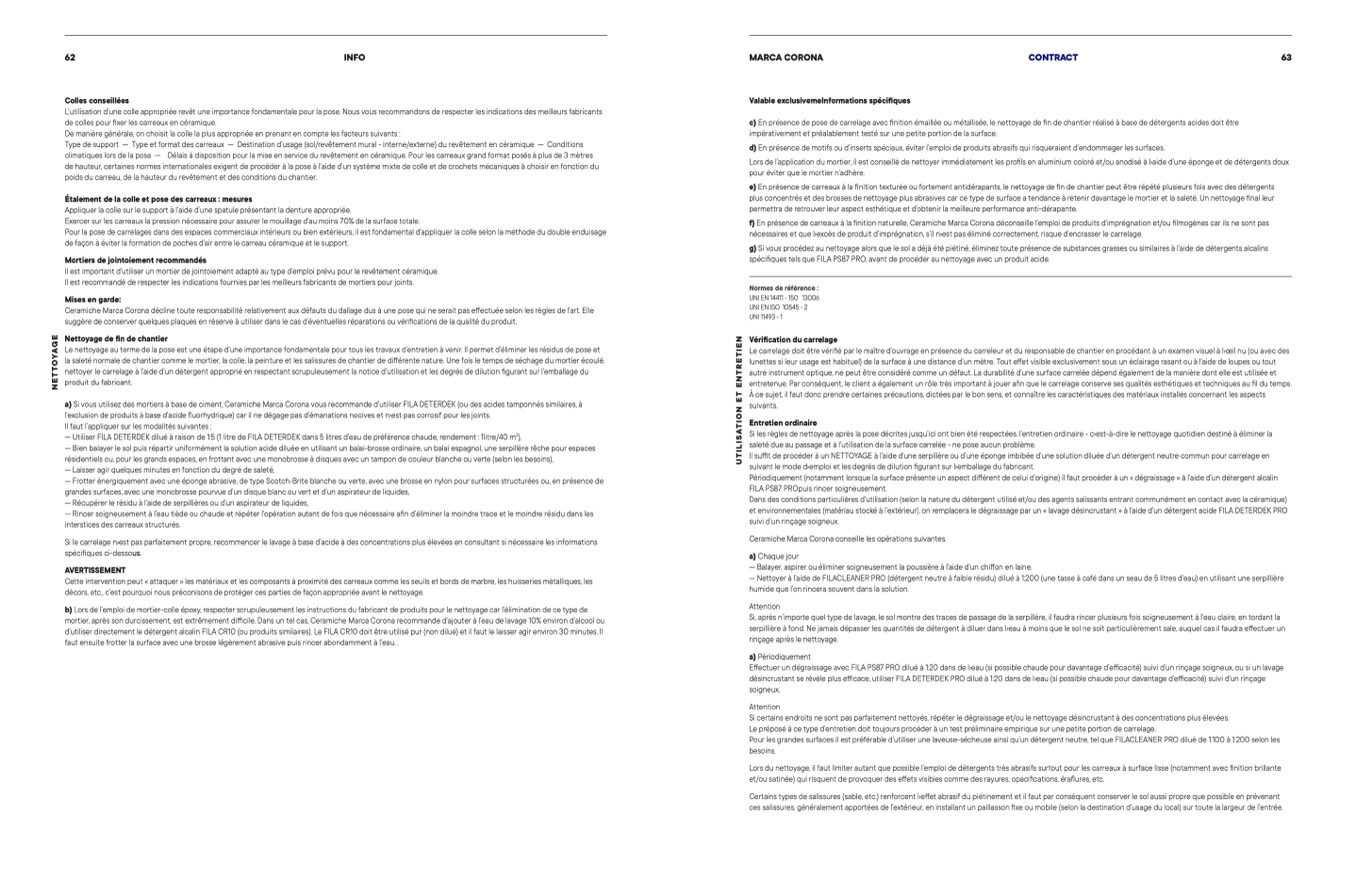 entretenue. Par conséquent, le client a également un rôle très important à jouer afin que le carrelage conserve ses qualités esthétiques et techniques au fil du temps.