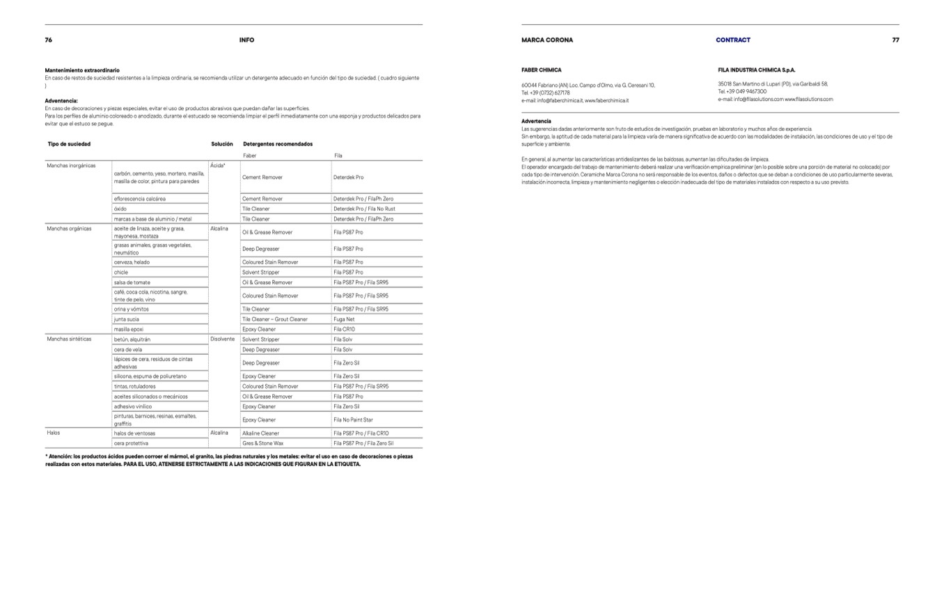 cada tipo de intervención. Ceramiche Marca Corona no será responsable de los eventos, daños o defectos que se deban a condiciones de uso particularmente severas,